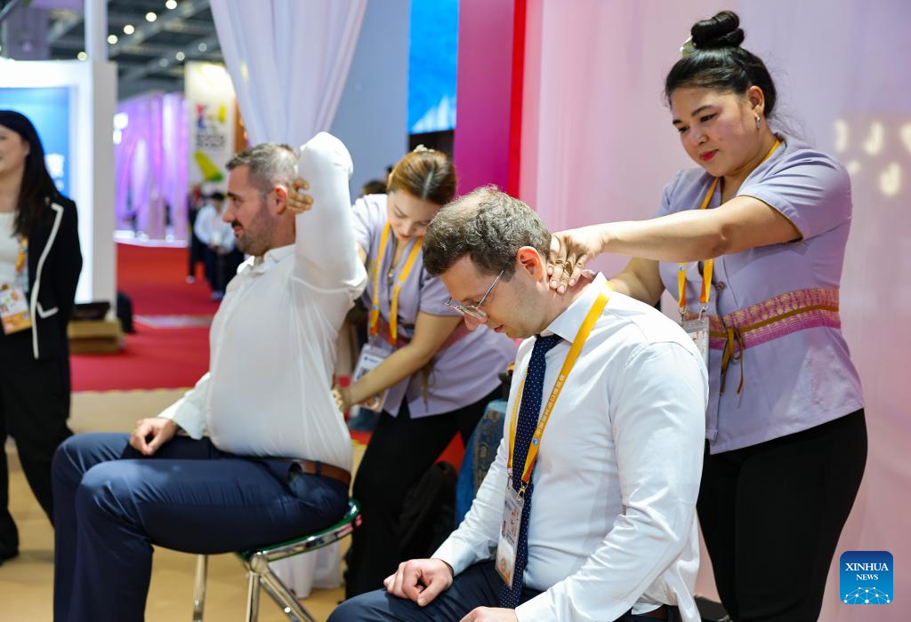 SHANGHAI, 5 noviembre, 2025 (Xinhua) -- Visitantes experimentan el masaje tailandés en el Pabellón de Tailandia durante la VIII Exposición Internacional de Importaciones de China (CIIE, por sus siglas en inglés), en Shanghai, en el este de China, el 5 de noviembre de 2025. La VIII CIIE se inauguró aquí el miércoles. Tailandia, Emiratos Arabes Unidos, Nigeria, Georgia, Suecia y Colombia son los países invitados de honor en la CIIE de este año. (Xinhua/Wang Zecong)