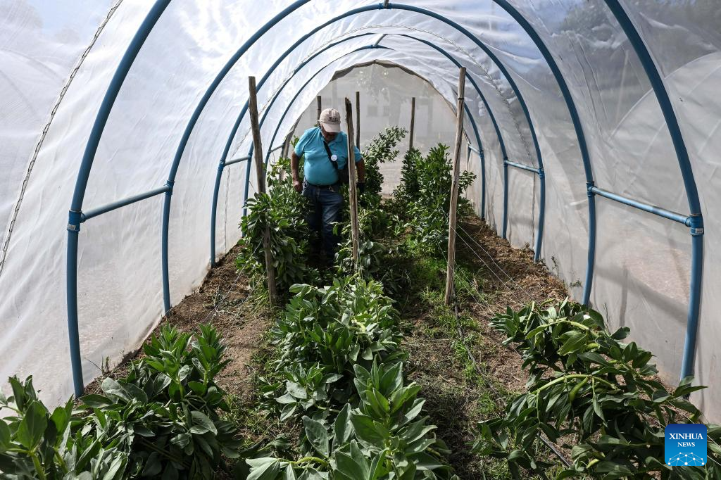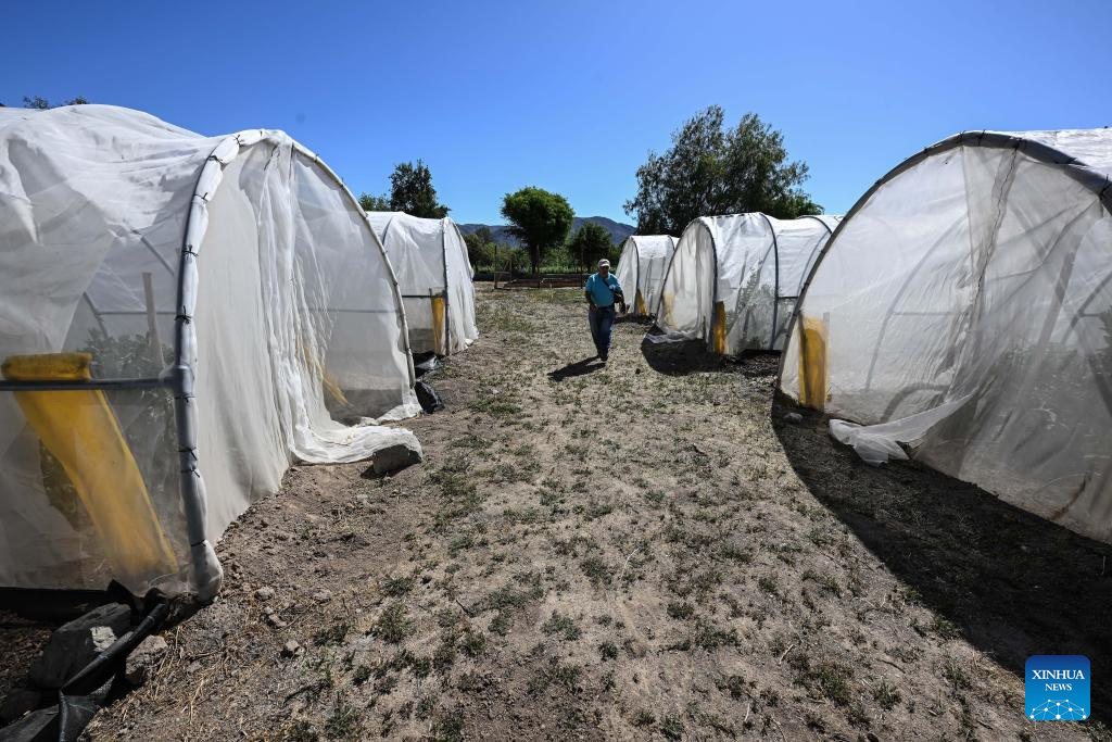COQUIMBO, 6 noviembre, 2025 (Xinhua) -- Imagen del 29 de octubre 2025 del agricultor Rolando Rojas caminando frente a invernaderos de plantación de habas en la Parcela de Multiplicación de Semillas del Instituto de Investigaciones Agropecuarias de Chile, en la comuna de Vicuña, en la región de Coquimbo, Chile. La sequía estructural que azota en el norte chileno ha cambiado la forma de hacer agricultura. Sin embargo, un grupo de resilientes agricultores se han transformado en los "guardianes de las semillas", al cuidar los granos para proteger el ecosistema y los sabores atávicos de los eclécticos valles del país sudamericano. (Xinhua/Jorge Villegas)