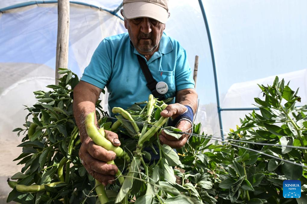 COQUIMBO, 6 noviembre, 2025 (Xinhua) -- Imagen del 29 de octubre 2025 del agricultor Rolando Rojas trabajando en una plantación de habas en la Parcela de Multiplicación de Semillas del Instituto de Investigaciones Agropecuarias de Chile, en la comuna de Vicuña, en la región de Coquimbo, Chile. La sequía estructural que azota en el norte chileno ha cambiado la forma de hacer agricultura, sin embargo, un grupo de resilientes agricultores se han transformado en los "guardianes de las semillas", al cuidar los granos para proteger el ecosistema y los sabores atávicos de los eclécticos valles del país sudamericano. (Xinhua/Jorge Villegas)