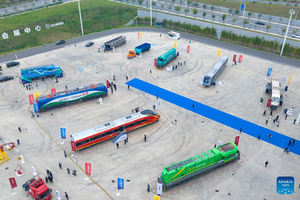 ZHUZHOU, 7 noviembre, 2025 (Xinhua) -- Vista aérea tomada con un dron el 7 de noviembre de 2025 de la zona de exhibición al aire libre de la Exposición Internacional de la Industria del Transporte Ferroviario y Fabricación de Equipos de China 2025, en Zhuzhou, en la provincia de Hunan, en el centro de China. Con una superficie de exhibición de unos 40.000 metros cuadrados, la exposición comenzó aquí el viernes, abarcando una amplia gama de sectores, como el transporte ferroviario y la fabricación de equipos, piezas clave y materias primas, demostración de alta tecnología, sistemas inteligentes, operación y mantenimiento, y diseño y consultoría de infraestructura. La levitación magnética y otras tecnologías de vanguardia se destacan en este evento. (Xinhua/Chen Sihan)