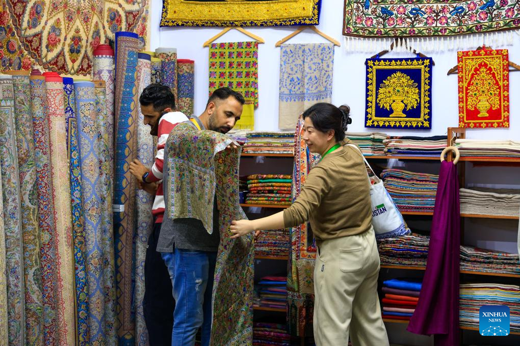 SHANGHAI, 8 noviembre, 2025 (Xinhua) -- Una visitante (d) aprende sobre los productos en un estand de alfombras de Pakistán en el área de exposición de Bienes de Consumo durante la VIII Exposición Internacional de Importaciones de China (CIIE, por sus siglas en inglés), en Shanghai, en el este de China, el 8 de noviembre de 2025. En el área de exposición de Bienes de Consumo de la VIII CIIE se exhibieron de forma destacada prendas de vestir, productos químicos de uso diario, muebles para el hogar y productos culturales y deportivos, lo que refleja las tendencias de consumo mundiales y las mejoras en la calidad de vida. (Xinhua/Liu Jiaqi)