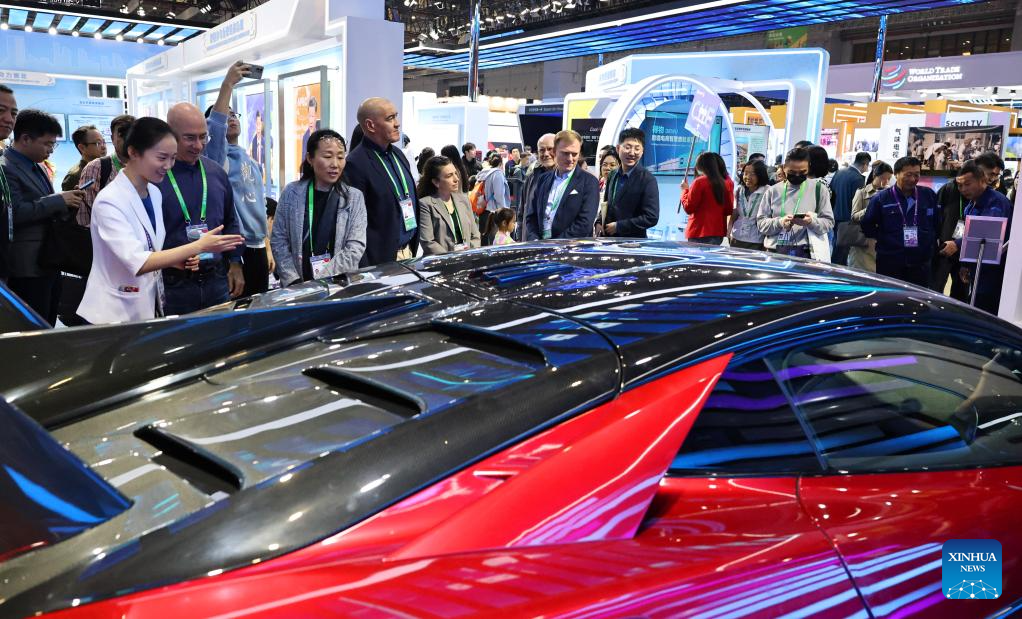 SHANGHAI, 8 noviembre, 2025 (Xinhua) -- Invitados observan un vehículo de nueva energía (VNE) de BYD, el fabricante líder de VNE de China, en el Pabellón de China durante la VIII Exposición Internacional de Importaciones de China (CIIE, por sus siglas en inglés), en Shanghai, en el este de China, el 8 de noviembre de 2025. Más de 30 talentos extranjeros y sus familias fueron invitados a visitar la VIII CIIE en el Centro Nacional de Convenciones y Exposiciones (Shanghai) durante un evento temático el sábado. (Xinhua/Fang Zhe)