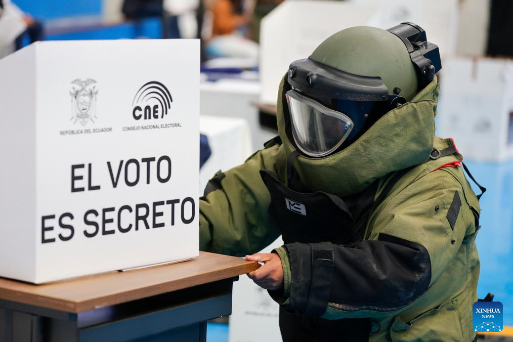QUITO, 9 noviembre, 2025 (Xinhua) -- Un técnico de la Unidad de Desactivación de Explosivos ejecuta un procedimiento de seguridad preventiva durante el Simulacro Nacional de la Consulta Popular y Referendo 2025, organizado por el Consejo Nacional Electoral (CNE) en el auditorio de la Universidad Politécnica Salesiana, en la ciudad Quito, en la capital de Ecuador, el 9 de noviembre de 2025. El CNE de Ecuador realizó el domingo un simulacro a nivel nacional de la consulta popular y el referendo constitucional convocados por el Gobierno para el próximo 16 de noviembre, informó la presidenta del organismo, Diana Atamaint. (Xinhua/Ricardo Landeta)