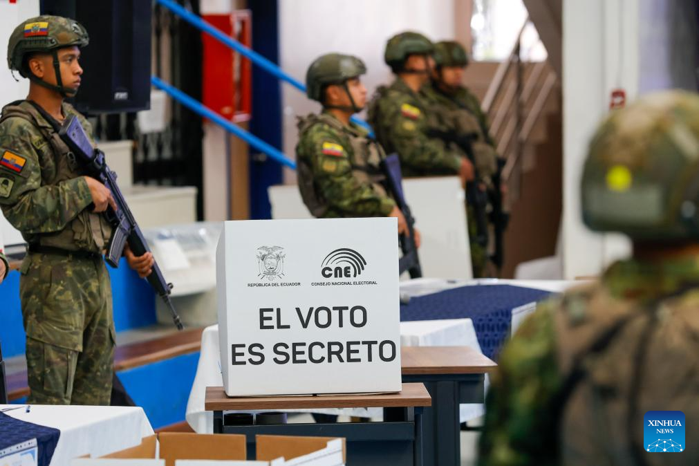 QUITO, 9 noviembre, 2025 (Xinhua) -- Elementos de las Fuerzas Armadas vigilan durante el Simulacro Nacional de la Consulta Popular y Referendo 2025, organizado por el Consejo Nacional Electoral (CNE) en el auditorio de la Universidad Politécnica Salesiana, en la ciudad Quito, en la capital de Ecuador, el 9 de noviembre de 2025. El CNE de Ecuador realizó el domingo un simulacro a nivel nacional de la consulta popular y el referendo constitucional convocados por el Gobierno para el próximo 16 de noviembre, informó la presidenta del organismo, Diana Atamaint. (Xinhua/Ricardo Landeta)