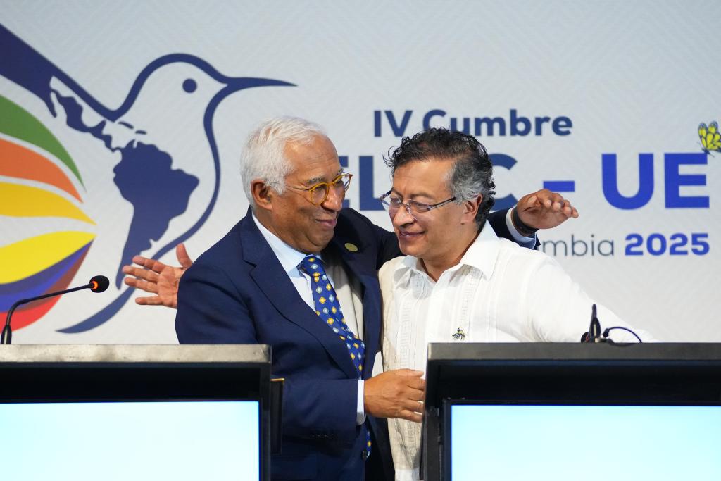 SANTA MARTA, 9 noviembre, 2025 (Xinhua) -- El presidente colombiano, Gustavo Petro (d), se abraza con el presidente del Consejo Europeo, Antonio Costa (i), durante una declaración conjunta al término del primer día de la IV Cumbre de la Comunidad de Estados Latinoamericanos y Caribeños-Unión Europea (CELAC-UE), en Santa Marta, Colombia, el 9 de noviembre de 2025. (Xinhua/Andrés Moreno)