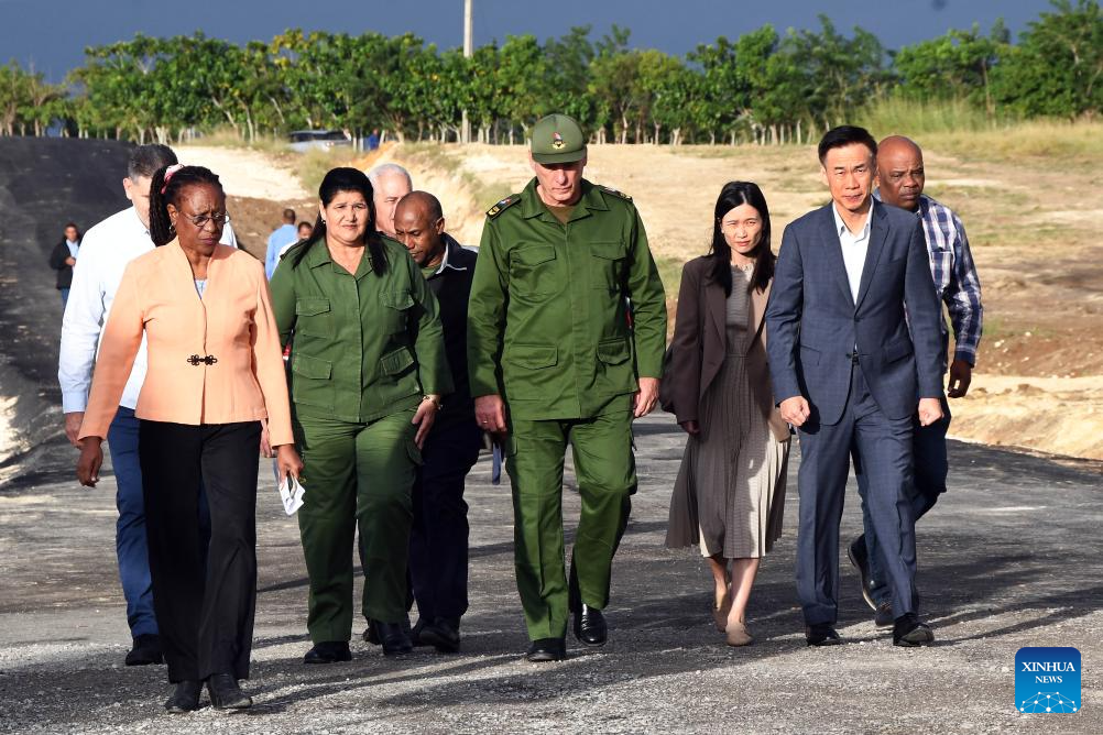 ARTEMISA, 12 noviembre, 2025 (Xinhua) -- El presidente cubano, Miguel Díaz-Canel (c-frente), el embajador de China en Cuba, Hua Xin (d-frente), caminan por una calle del nuevo parque fotovoltaico con asistencia china en el marco de su inauguración, en la provincia de Artemisa, en el oeste de Cuba, el 12 de noviembre de 2025. Un nuevo parque fotovoltaico con asistencia china fue inaugurado el miércoles en la provincia cubana de Artemisa, a unos 50 km al oeste de La Habana. (Xinhua/Joaquín Hernández)