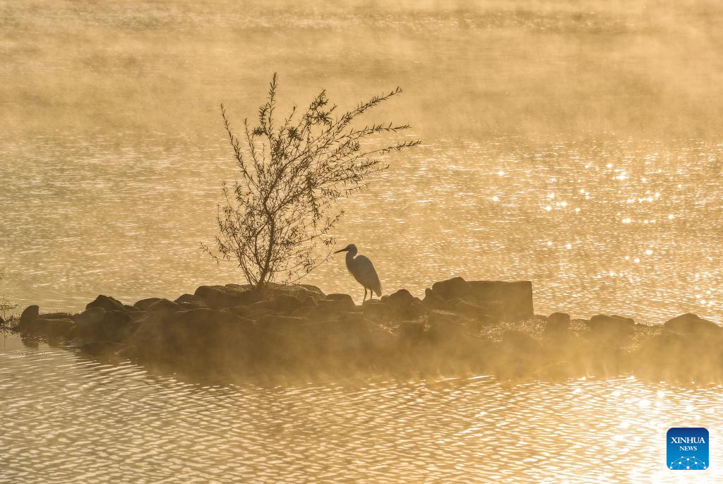 HUANGSHAN, 14 noviembre, 2025 (Xinhua) -- Imagen del 14 de noviembre de 2025 del lago Qishu envuelto en la niebla matutina, en el distrito de Yixian, en la provincia de Anhui, en el este de China. (Xinhua/Shi Yalei)