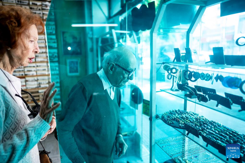 BUENOS AIRES, 19 noviembre, 2025 (Xinhua) -- El maestro botonero, Eduardo Alonso (d), atiende a una clienta en su establecimiento "El rey de los botones", en la ciudad de Buenos Aires, Argentina, el 19 de noviembre de 2025. Un hombre de 86 años que reside en la capital de Argentina, Buenos Aires, mantiene vivo el oficio de hacer botones, una verdadera pasión artesanal por la que es reconocido a diario por vecinos e incluso turistas, que se acercan a conocer y admirar su esmerada labor en el populoso barrio de Flores. (Xinhua/Martín Zabala)