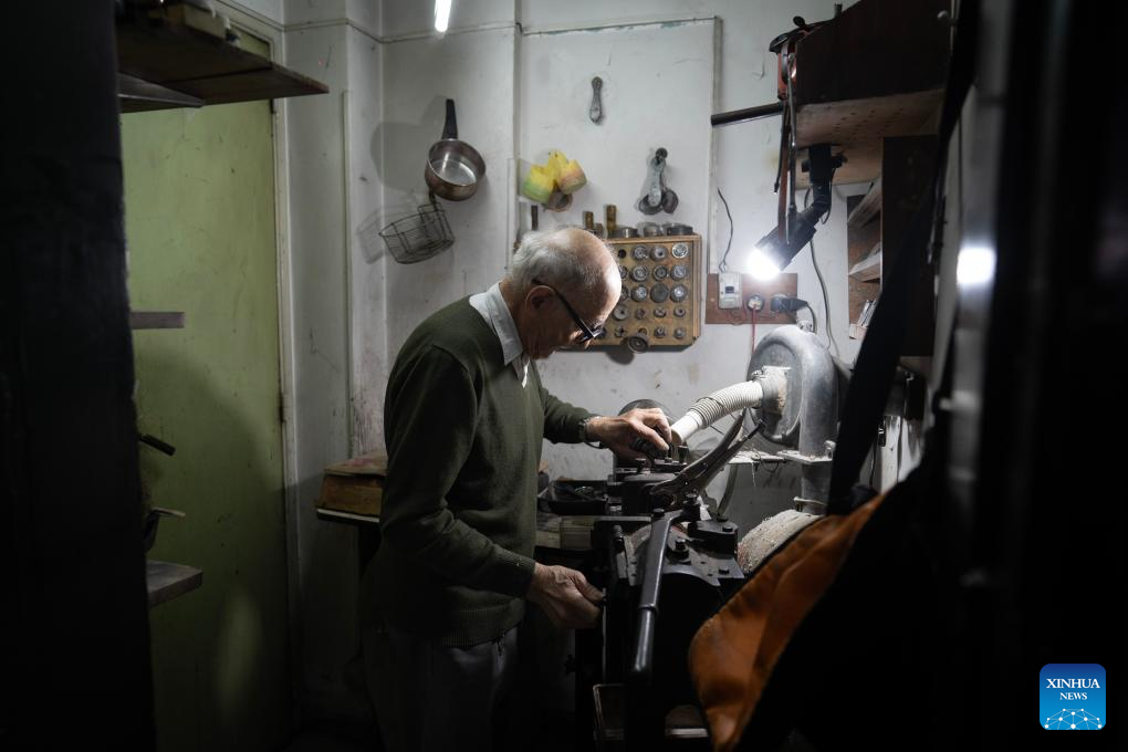 BUENOS AIRES, 19 noviembre, 2025 (Xinhua) -- El maestro botonero, Eduardo Alonso, realiza un grabado artístico en un botón en su establecimiento "El rey de los botones", en la ciudad de Buenos Aires, Argentina, el 19 de noviembre de 2025. Un hombre de 86 años que reside en la capital de Argentina, Buenos Aires, mantiene vivo el oficio de hacer botones, una verdadera pasión artesanal por la que es reconocido a diario por vecinos e incluso turistas, que se acercan a conocer y admirar su esmerada labor en el populoso barrio de Flores. (Xinhua/Martín Zabala)