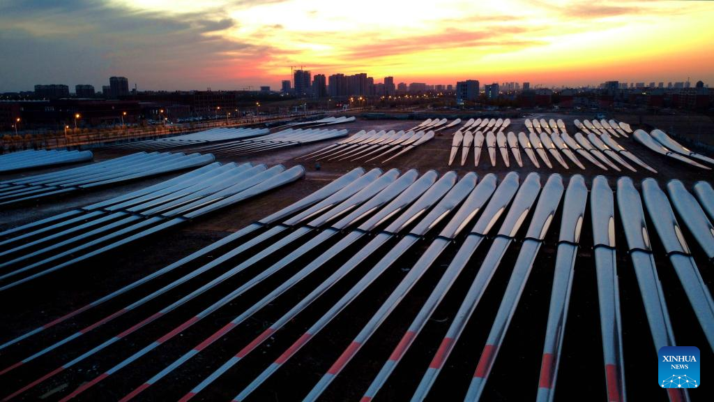 JINAN, 20 noviembre, 2025 (Xinhua) -- Vista aérea tomada con un dron del 19 de noviembre de 2025 de un patio de almacenamiento de aspas del parque industrial de fabricación de equipos de energía eólica, en el distrito de Huimin, en la provincia de Shandong, en el este de China. En 2020, China anunció que se esforzaría por alcanzar el pico de emisiones de dióxido de carbono antes de 2030 y la neutralidad de carbono antes de 2060. (Xinhua/Guo Xulei)