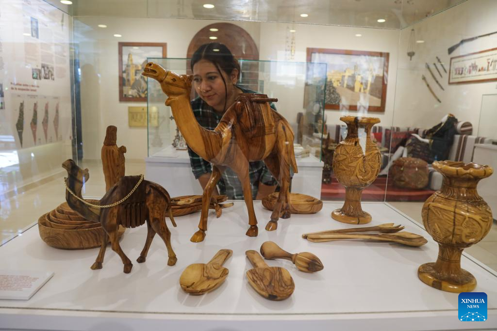 Imagen del 27 de noviembre de 2025 de una mujer observando piezas y atuendos artesanales en madera sobre la historia de Palestina en el Museo Palestino de El Salvador, en el departamento de San Salvador, capital de El Salvador. El Museo Palestino de El Salvador, reconocido como el único espacio en su tipo en Iberoamérica, reúne objetos históricos y expresiones artísticas que muestran la identidad cultural de Palestina, cuya tradición ha trascendido fronteras y continúa transmitiéndose a nuevas generaciones. (Xinhua/Alexander Peña)