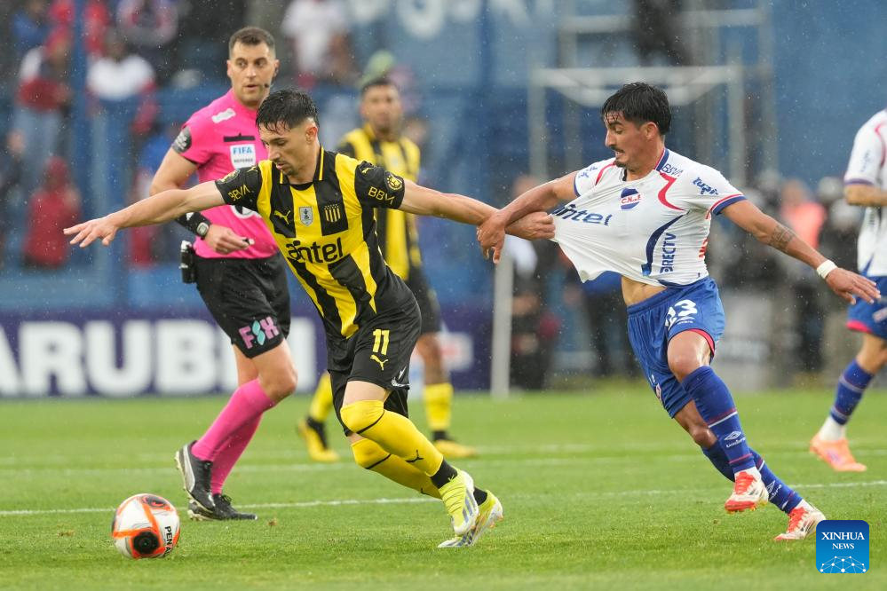 MONTEVIDEO, 1 diciembre, 2025 (Xinhua) -- Imagen del 30 de noviembre de 2025 del jugador Lucas Rodríguez (d), de Nacional, disputando el balón con Maximiliano Silvera (i), de Peñarol, durante el partido correspondiente a la final de la Liga AUF Uruguay, celebrado en el estadio Gran Parque Central, en Montevideo, capital de Uruguay. (Xinhua/Nicolás Celaya)