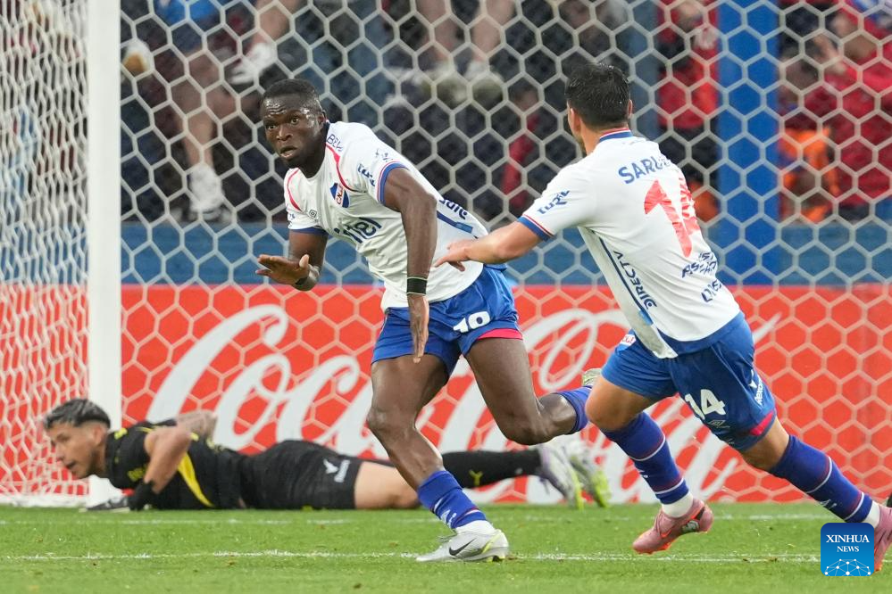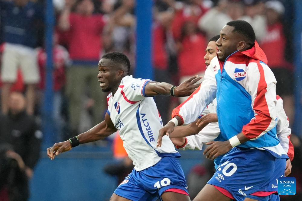 MONTEVIDEO, 1 diciembre, 2025 (Xinhua) -- Imagen del 30 de noviembre de 2025 del jugador Christian Ebere (c), de Nacional, festejando su anotación, durante el partido correspondiente a la final de la Liga AUF Uruguay, ante Peñarol, celebrado en el estadio Gran Parque Central, en Montevideo, capital de Uruguay. (Xinhua/Nicolás Celaya)