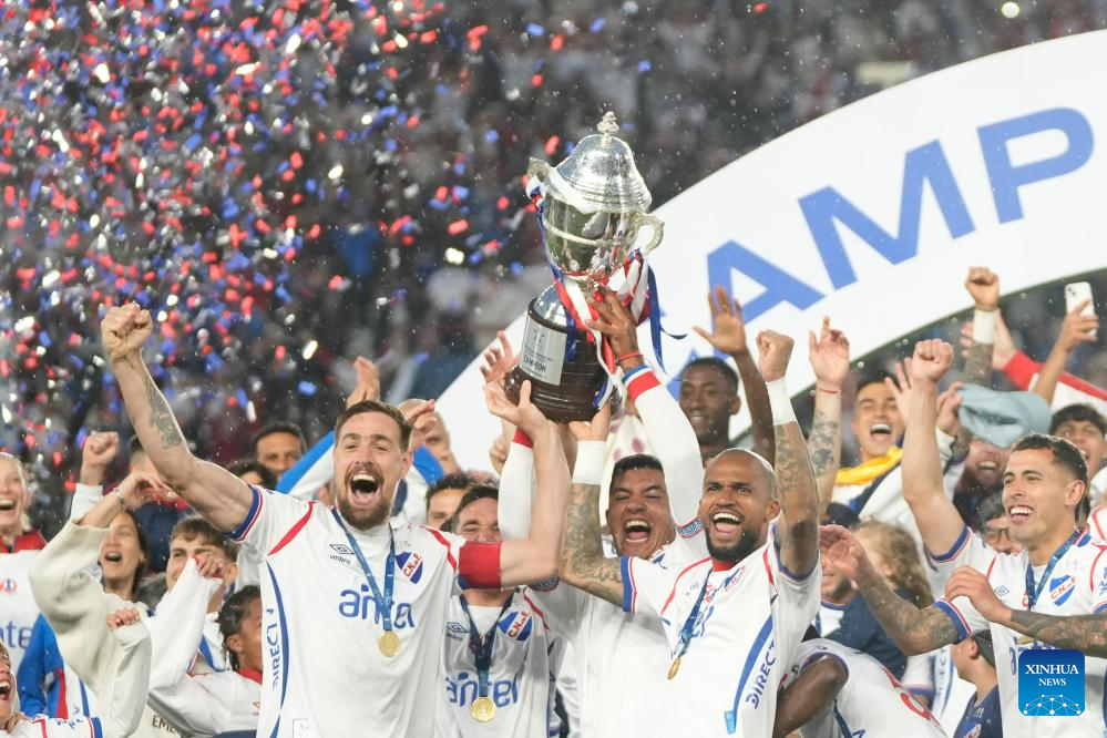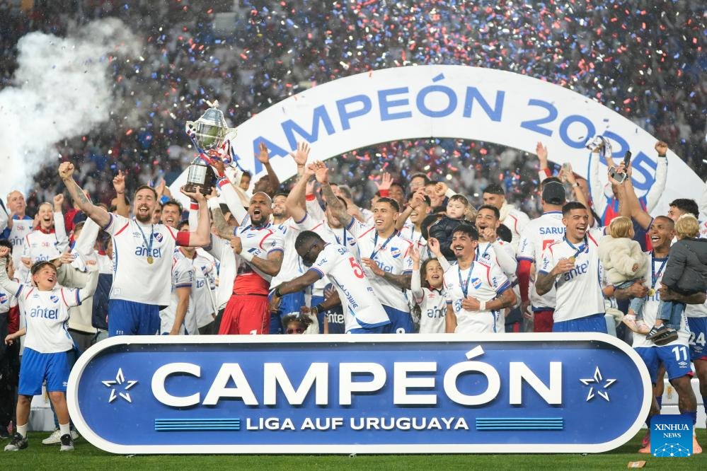 MONTEVIDEO, 1 diciembre, 2025 (Xinhua) -- Imagen del 30 de noviembre de 2025 de jugadores de Nacional, festejando la obtención del campeonato al término del partido correspondiente a la final de la Liga AUF Uruguay, ante Peñarol celebrado en el estadio Gran Parque Central, en Montevideo, capital de Uruguay. (Xinhua/Nicolás Celaya)