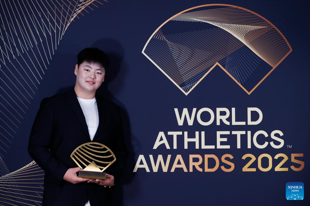 MONTE CARLO, 1 diciembre, 2025 (Xinhua) -- Imagen del 30 de noviembre de 2025 de la atleta de lanzamiento de martillo, Zhang Jiale, de China, posando con su premio de Estrella Ascendente Femenino durante los Premios Mundiales de Atletismo 2025, en Monte Carlo, Mónaco. (Xinhua/Gao Jing)