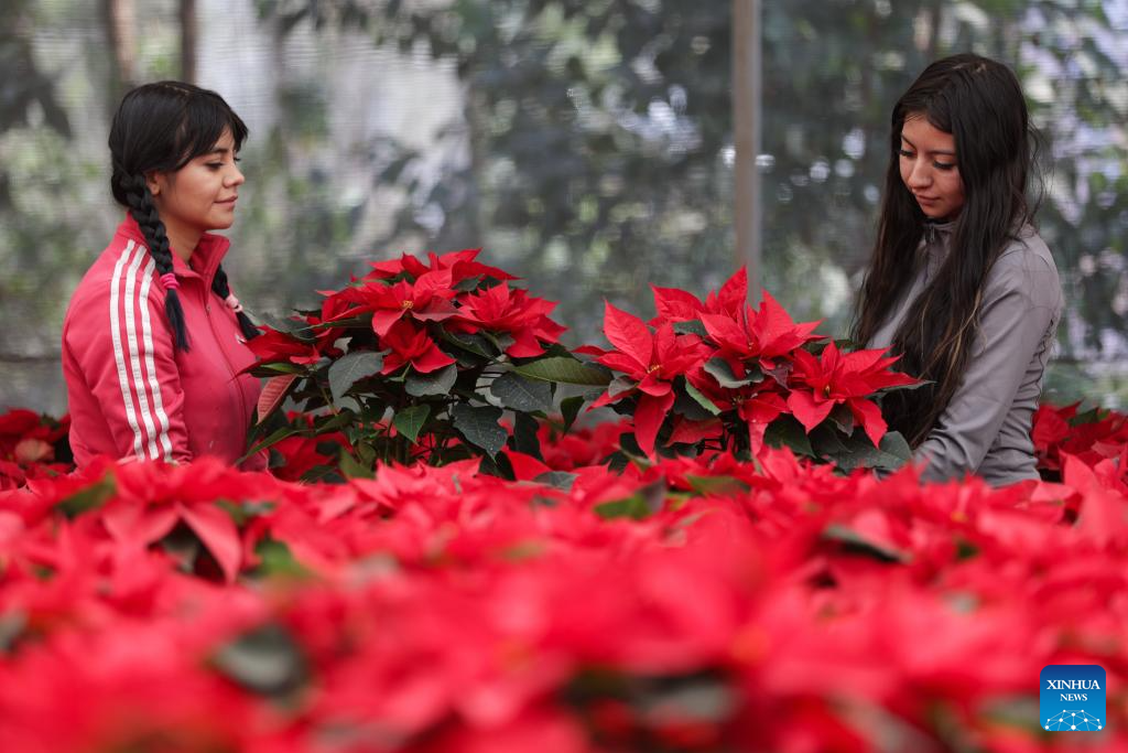 CIUDAD DE MEXICO, 6 diciembre, 2025 (Xinhua) -- Imagen del 5 de diciembre de 2025 de mujeres transportando flores de Nochebuena, en la Ciudad de México, capital de México. (Xinhua/Francisco Cañedo)