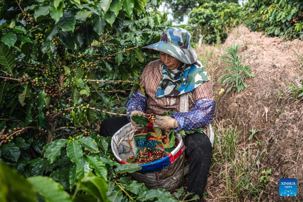 PU'ER, 6 diciembre, 2025 (Xinhua) -- Una agricultora recolecta cerezas de café frescas en un cafetal, en la ciudad de Pu'er, en la provincia de Yunnan, en el suroeste de China, el 6 de diciembre de 2025. Pu'er cuenta actualmente con 703.900 mu (aproximadamente 46.927 hectáreas) de café bajo cultivo, con una producción anual de 84.000 toneladas de granos. (Xinhua/Wang Guansen)