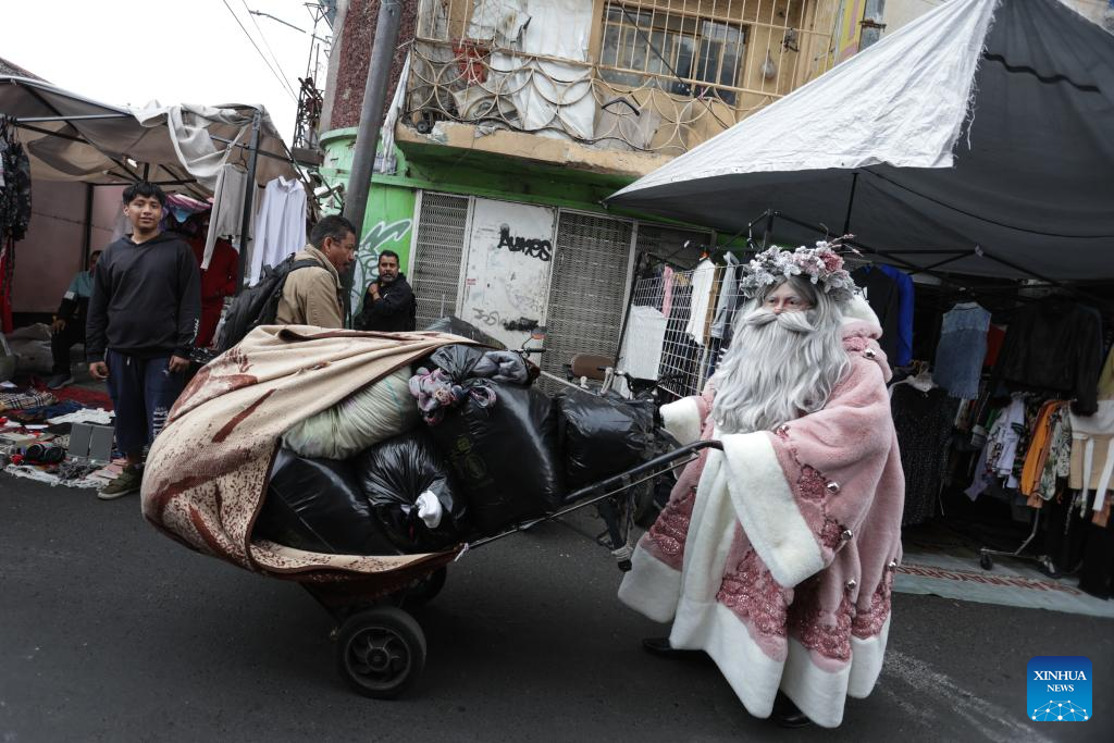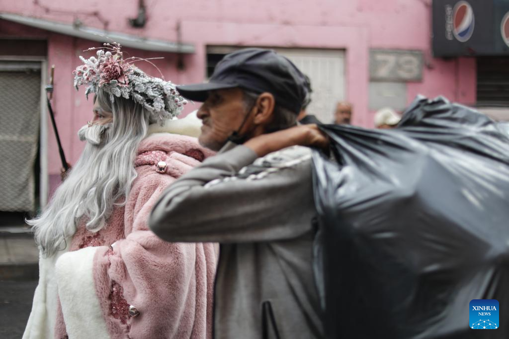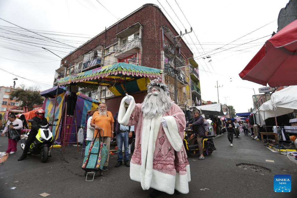 CIUDAD DE MEXICO, 10 diciembre, 2025 (Xinhua) -- Imagen del 8 de diciembre de 2025 del "Santa Iluminado" (i), personaje caracterizado por el artista José Miguel Moctezuma, recorriendo una calle del barrio de Tepito, en la Ciudad de México, capital de México. (Xinhua/Francisco Cañedo)