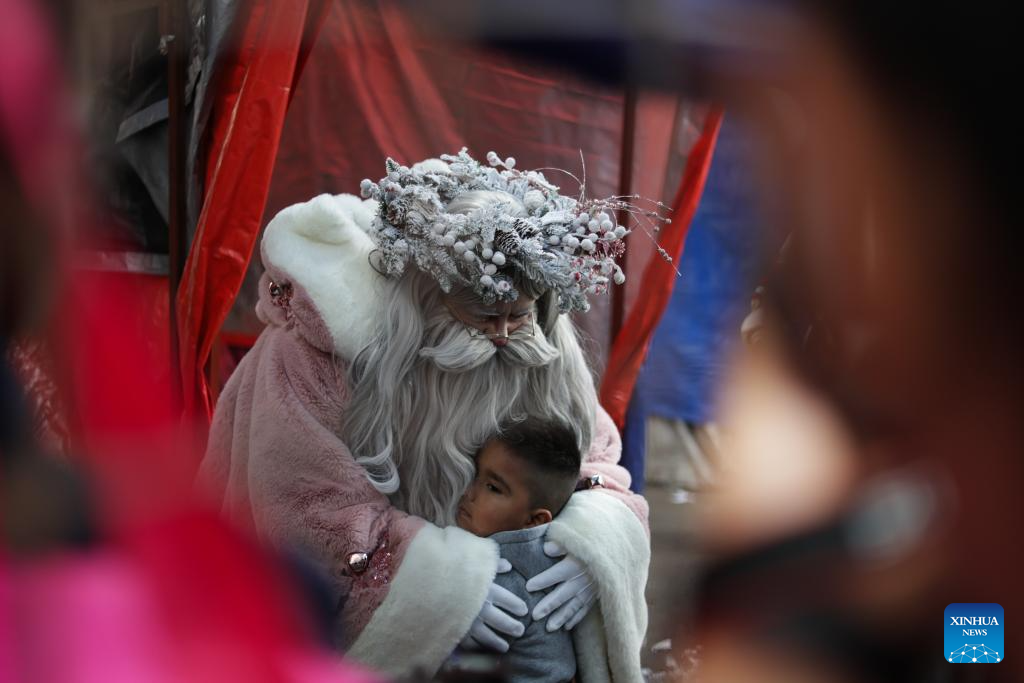 CIUDAD DE MEXICO, 10 diciembre, 2025 (Xinhua) -- Imagen del 8 de diciembre de 2025 del "Santa Iluminado", personaje caracterizado por el artista José Miguel Moctezuma, abrazando a un niño durante su recorrido por una calle del barrio de Tepito, en la Ciudad de México, capital de México. (Xinhua/Francisco Cañedo)