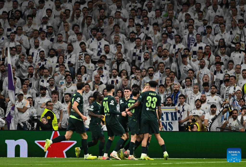 MADRID, 11 diciembre, 2025 (Xinhua) -- Imagen del 10 de diciembre de 2025 de jugadores de Manchester City festejando una anotación durante el partido de fútbol de la Liga de Campeones de la UEFA, entre Real Madrid y Manchester City, en Madrid, España. (Xinhua/Cheng Min)