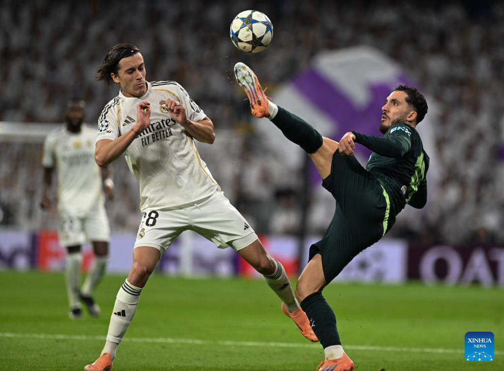 MADRID, 11 diciembre, 2025 (Xinhua) -- Imagen del 10 de diciembre de 2025 de Vinicius Junior (d), de Real Madrid, cabeceando el balón durante el partido de fútbol de la Liga de Campeones de la UEFA, entre Real Madrid y Manchester City, en Madrid, España. (Xinhua/Cheng Min)