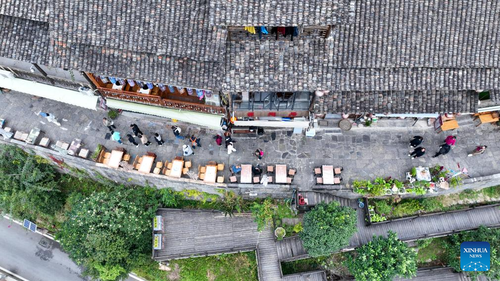CHONGQING, 11 diciembre, 2025 (Xinhua) -- Vista aérea tomada con un dron del 11 de diciembre de 2025 de turistas visitando el antiguo poblado de Gongtan, en el distrito autónomo tujia y miao de Youyang, en la municipalidad de Chongqing, en el suroeste de China. (Xinhua/Qiu Hongbin)
