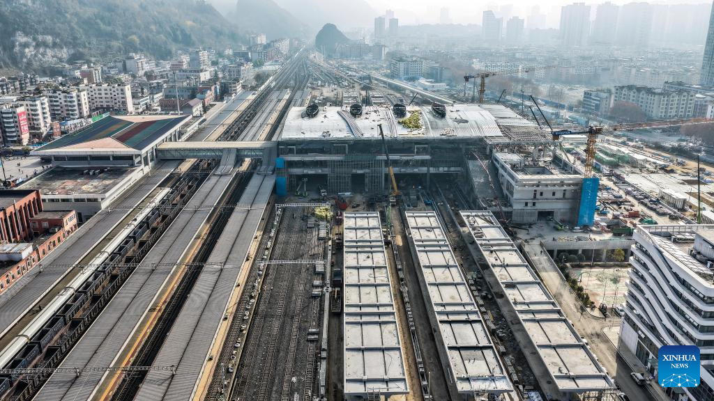 LIUPANSHUI, 11 diciembre, 2025 (Xinhua) -- Vista aérea tomada con un dron el 11 de diciembre de 2025 de un sitio de construcción del proyecto de renovación del edificio y patio de la Estación del Ferrocarril de Liupanshui, en la ciudad de Liupanshui, en la provincia de Guizhou, en el suroeste de China. El proyecto de renovación del edificio y patio de la Estación del Ferrocarril de Liupanshui del Ferrocarril de Alta Velocidad Anshun-Liupanshui está avanzando de manera constante en la actualidad. (Xinhua/Tao Liang)