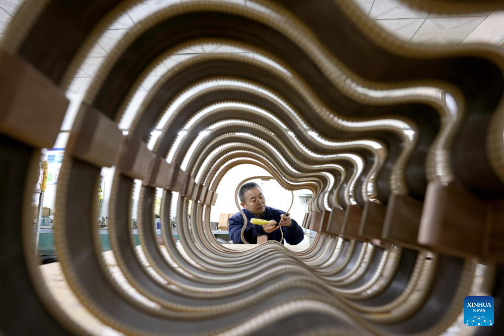Un trabajador elabora guitarras en una fábrica, en el poblado de Mengzhuang de Zaozhuang, en la provincia de Shandong, en el este de China, el 15 de diciembre de 2025. La economía de China mantuvo un impulso estable en noviembre, creando condiciones favorables para alcanzar el objetivo de crecimiento anual, según revelan los últimos indicadores económicos publicados el lunes. En noviembre, la producción industrial de valor agregado del país se expandió un 4,8 por ciento interanual. En los primeros 11 meses, la producción industrial aumentó un 6 por ciento. (Xinhua/Sun Zhongzhe)