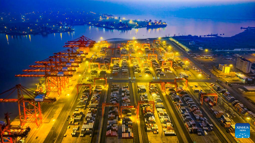 Vista aérea tomada con un dron el 15 de diciembre de 2025 de un muelle de contenedores en el puerto de Tangshan, en Tangshan, en la provincia de Hebei, en el norte de China. La economía de China mantuvo un impulso estable en noviembre, creando condiciones favorables para alcanzar el objetivo de crecimiento anual, según revelan los últimos indicadores económicos publicados el lunes. En noviembre, la producción industrial de valor agregado del país se expandió un 4,8 por ciento interanual. En los primeros 11 meses, la producción industrial aumentó un 6 por ciento. (Xinhua/Liu Mancang)