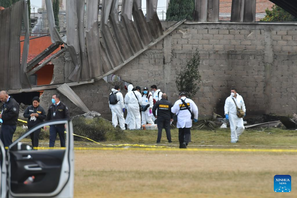 Elementos de la Fiscalía del Estado de México trabajan en el sitio de un accidente de una aeronave, en los suburbios de la ciudad de Toluca, Estado de México, México, el 15 de diciembre de 2025. Al menos seis muertos dejó el lunes el desplome de una aeronave entre el municipio de San Mateo Atenco y Toluca, capital del central Estado de México, informó la oficina de Protección Civil de la entidad. (Xinhua/Arturo Hernández)