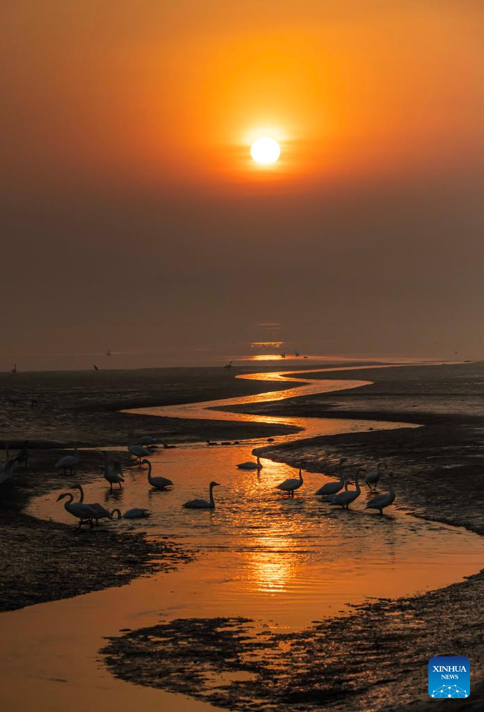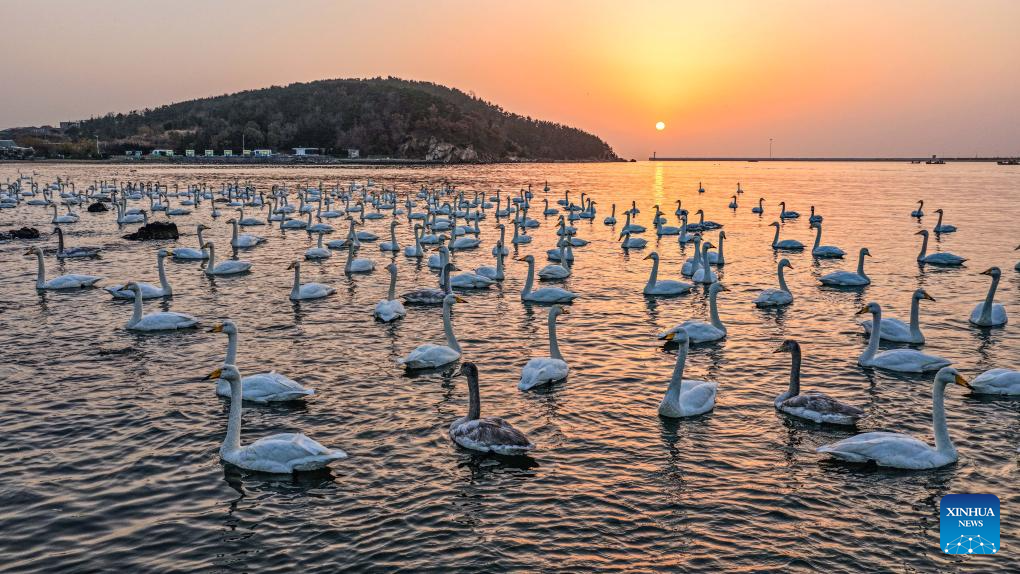 JINAN, 15 diciembre, 2025 (Xinhua) -- Imagen tomada con un dron el 7 de diciembre de 2025 de cisnes cantores, en el poblado de Chengshan de la ciudad de Rongcheng, en la provincia de Shandong, en el este de China. (Xinhua/Li Xinjun)