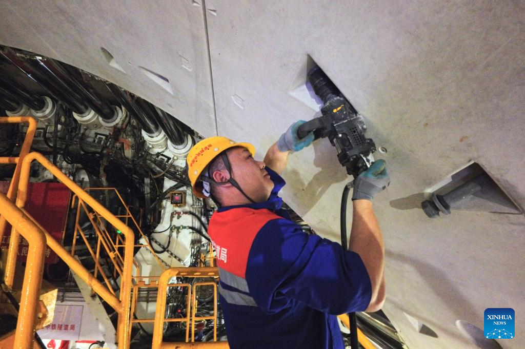 SHANGHAI, 16 diciembre, 2025 (Xinhua) -- Un trabajador aprieta un perno en el sitio de construcción del túnel Chongming-Taicang, parte del ferrocarril de alta velocidad Shanghai-Chongqing-Chengdu, bajo el río Yangtze, el 16 de diciembre de 2025. La excavación en curso del túnel bajo el río Yangtze, llevada a cabo por la mayor máquina tuneladora con escudo de gran diámetro del mundo para ferrocarriles de alta velocidad, la "Linghang", desarrollada de manera independiente por China, superó el martes la marca de los 10.000 metros, lo que sentó una base sólida para la finalización del túnel. (Xinhua/Fang Zhe)