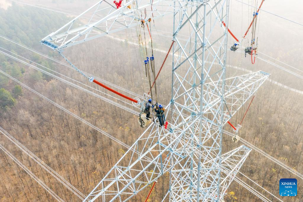 HEFEI, 17 diciembre, 2025 (Xinhua) -- Imagen tomada con un dron el 17 de diciembre de 2025 de constructores trabajando en una línea de transmisión de energía eléctrica, en la provincia de Anhui, en el este de China. La construcción del cuerpo principal de la línea de transmisión de energía eléctrica de 500 kV que va de Xiangjian a Ludao en la provincia de Anhui, concluyó con éxito el miércoles. Con una longitud total de 136,8 kilómetros, la línea optimizará aún más la estructura de la red eléctrica de Anhui y mejorará la fiabilidad del suministro eléctrico una vez finalizada. (Xinhua/Zheng Xianlie)
