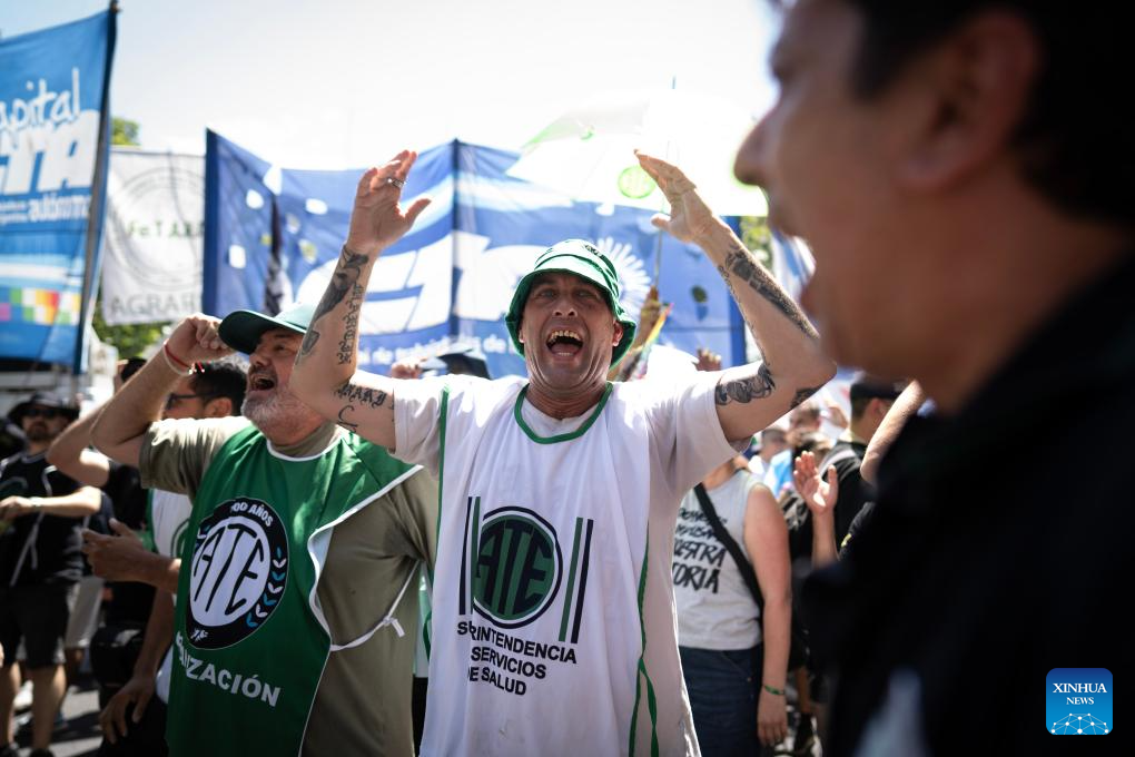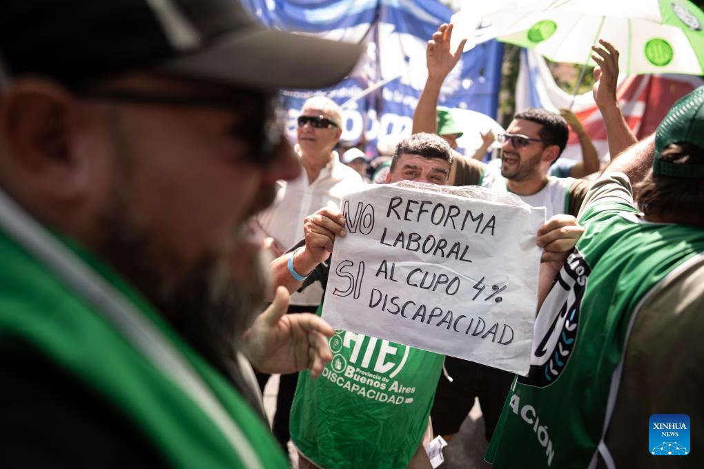 BUENOS AIRES, 18 dic (Xinhua) -- La Confederación General del Trabajo (CGT) y otras centrales sindicales de Argentina se movilizaron hoy jueves a la emblemática Plaza de Mayo, en el centro de la ciudad de Buenos Aires, para expresar su rechazo a un proyecto de reforma laboral que impulsa el Gobierno del presidente Javier Milei.