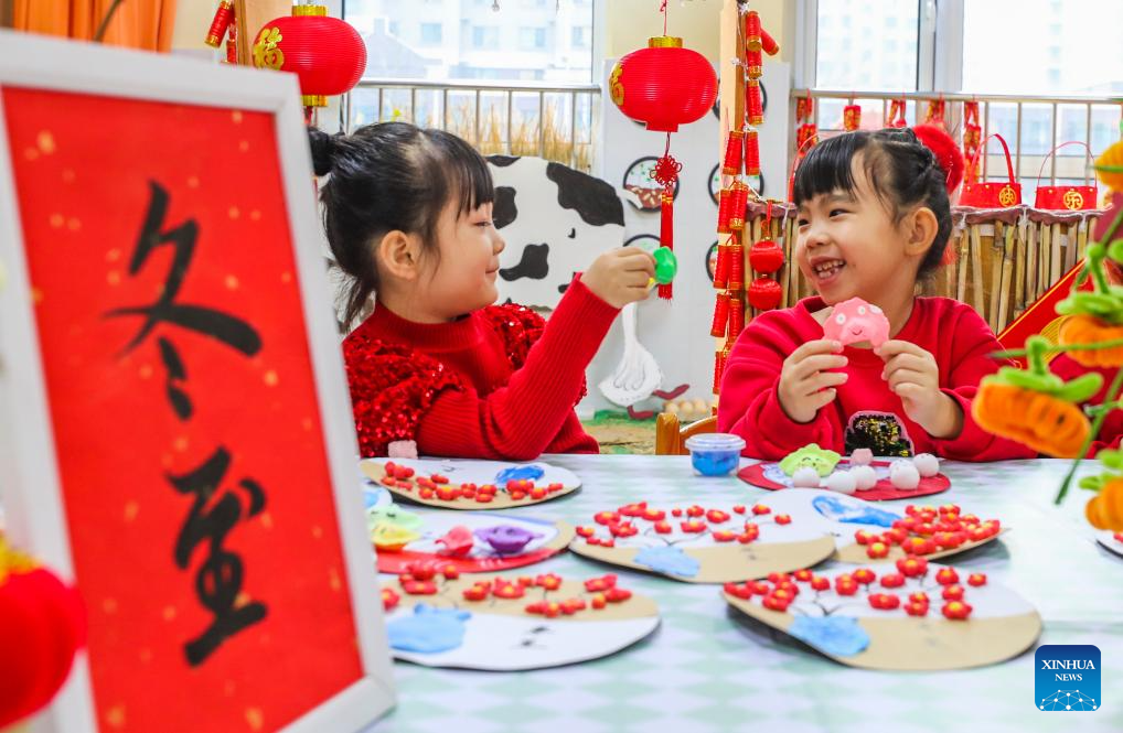 BEIJING, 18 diciembre, 2025 (Xinhua) -- Niñas de un jardín de infantes hacen manualidades con forma de dumplings, en la ciudad de Tangshan, en la provincia de Hebei, en el norte de China, el 18 de diciembre de 2025. Personas de todo el país celebraron el jueves diversos eventos para conmemorar el solsticio de invierno, que este año tendrá lugar el 21 de diciembre. El solsticio de invierno, el día más corto del año, marca el comienzo del invierno profundo y un descanso de la agricultura en la sociedad agrícola tradicional en la cultura china. (Xinhua/Liu Mancang)