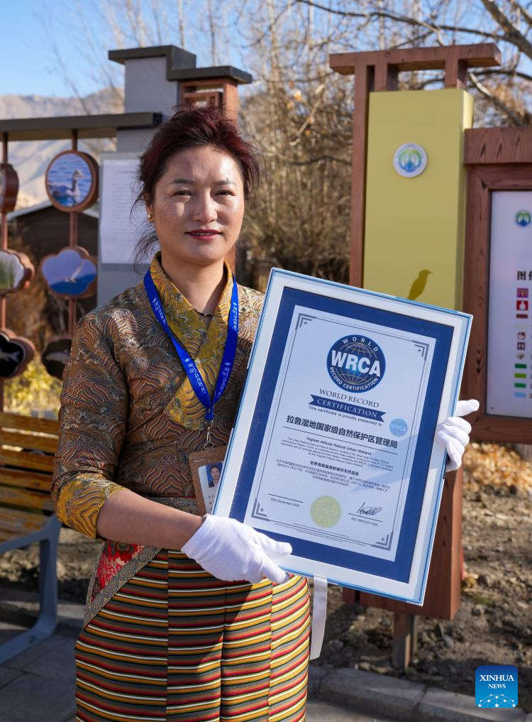 LHASA, 20 diciembre, 2025 (Xinhua) -- Una trabajadora de la Reserva Natural Nacional del Humedal de Lhalu muestra un certificado emitido por la Agencia de Certificación de Récords Mundiales (WRCA, por sus siglas en inglés), en Lhasa, en la región autónoma de Xizang, en el suroeste de China, el 20 de diciembre de 2025. Verificada por la Agencia de Certificación de Récords Mundiales (WRCA, por sus siglas en inglés), la Reserva Natural Nacional del Humedal de Lhalu ha sido confirmada como el "humedal natural urbano de mayor altitud". La ceremonia de certificación se llevó a cabo el sábado en el humedal. Ubicado en el área urbana de Lhasa, el humedal abarca una superficie de 12,2 kilómetros cuadrados a una altitud promedio de 3.649 metros. (Xinhua/Jigme Dorje)