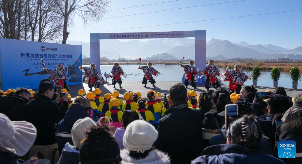 LHASA, 20 diciembre, 2025 (Xinhua) -- Una presentación se lleva a cabo en una ceremonia de certificación para la Reserva Natural Nacional del Humedal de Lhalu, en Lhasa, en la región autónoma de Xizang, en el suroeste de China, el 20 de diciembre de 2025. Verificada por la Agencia de Certificación de Récords Mundiales (WRCA, por sus siglas en inglés), la Reserva Natural Nacional del Humedal de Lhalu ha sido confirmada como el "humedal natural urbano de mayor altitud". La ceremonia de certificación se llevó a cabo el sábado en el humedal. Ubicado en el área urbana de Lhasa, el humedal abarca una superficie de 12,2 kilómetros cuadrados a una altitud promedio de 3.649 metros. (Xinhua/Jigme Dorje)