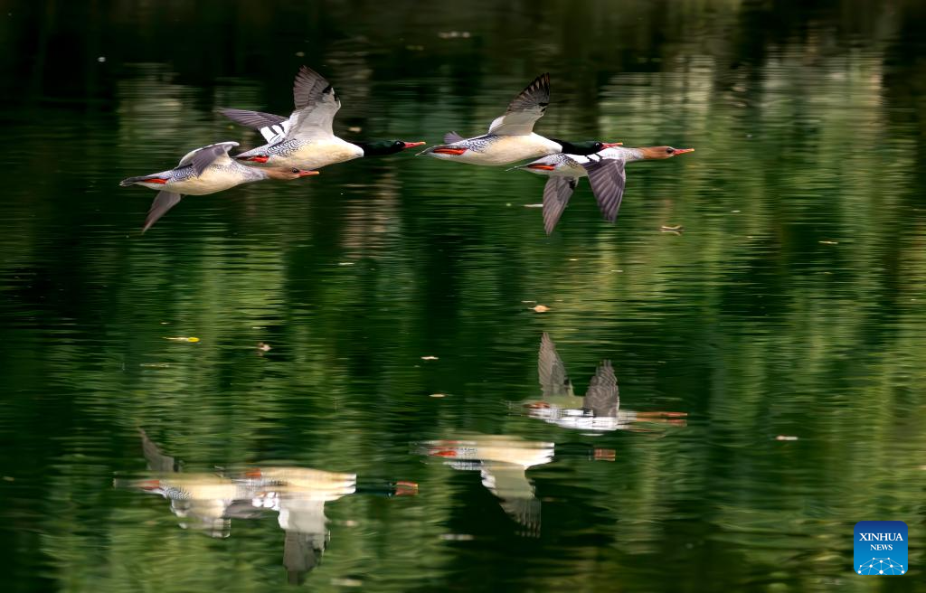 FUZHOU, 21 diciembre, 2025 (Xinhua) -- Imagen del 20 de diciembre de 2025 de serratas chinas volando sobre el río Dazhang, en el distrito de Yongtai, en la provincia de Fujian, en el sureste de China. Dieciséis serratas chinas, una especie protegida de primera clase a nivel nacional, fueron avistadas invernando aquí. (Xinhua/Wei Peiquan)