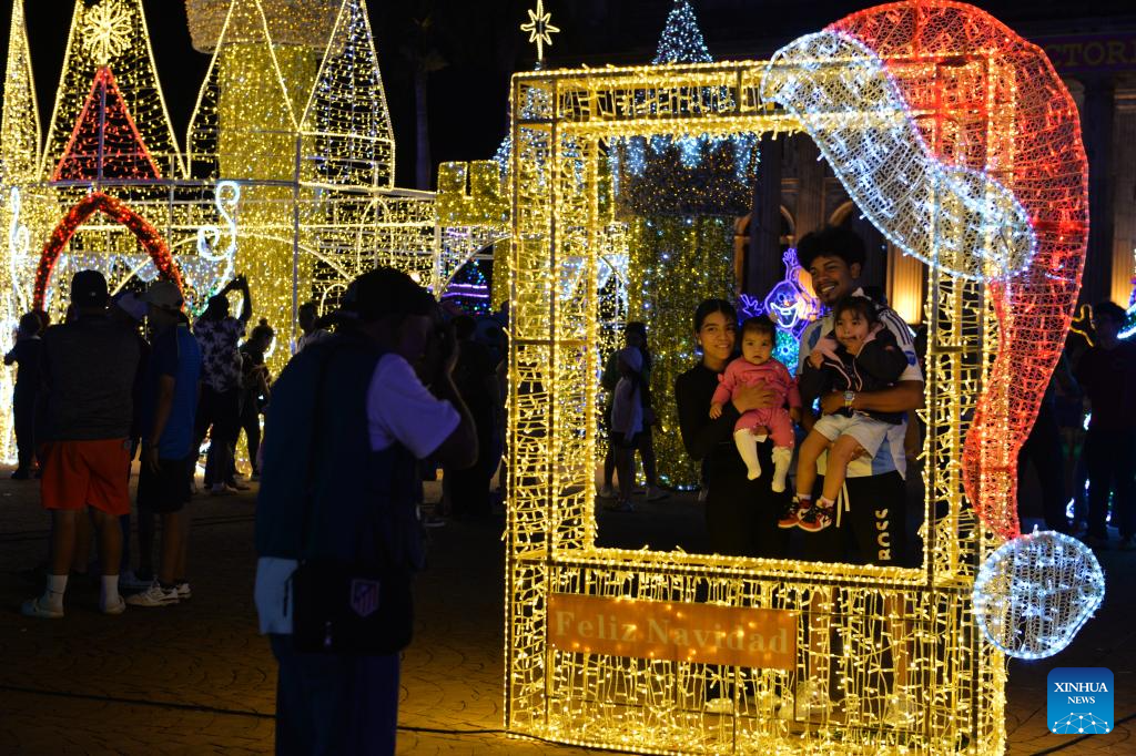 MANAGUA, 23 diciembre, 2025 (Xinhua) -- Imagen del 21 de diciembre de 2025 de personas posando para una fotografía en una instalación de luz por la temporada navideña, en Managua, Nicaragua. (Xinhua/Noelia Aráuz)