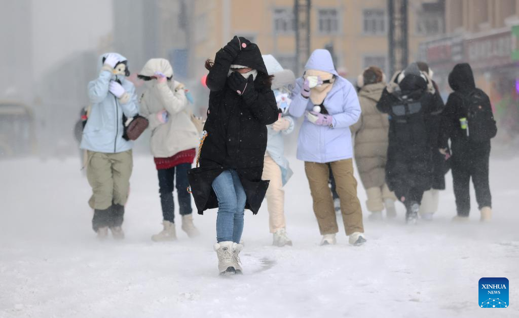 HARBIN, 23 diciembre, 2025 (Xinhua) -- Personas caminan por una calle bajo la nevada, en Harbin, en la provincia de Heilongjiang, en el noreste de China, el 23 de diciembre de 2025. El observatorio meteorológico de Harbin emitió el martes una alerta amarilla por ventisca. (Xinhua/Zhang Shu)