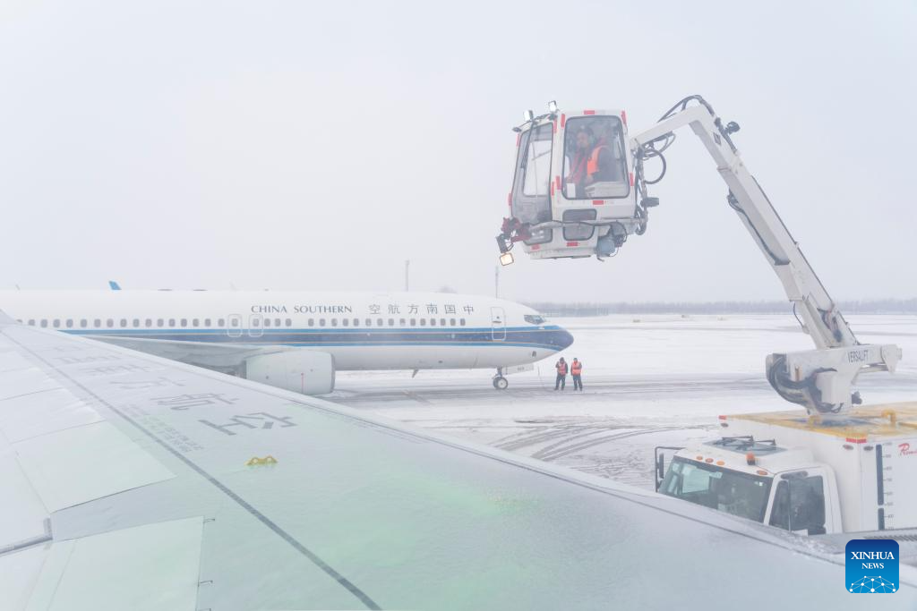 HARBIN, 23 diciembre, 2025 (Xinhua) -- Trabajadores realizan operaciones de deshielo y remoción de nieve a una aeronave en el Aeropuerto Internacional Taiping de Harbin, en Harbin, en la provincia de Heilongjiang, en el noreste de China, el 23 de diciembre de 2025. El observatorio meteorológico de Harbin emitió el martes una alerta amarilla por ventisca. (Xinhua/Xie Jianfei)