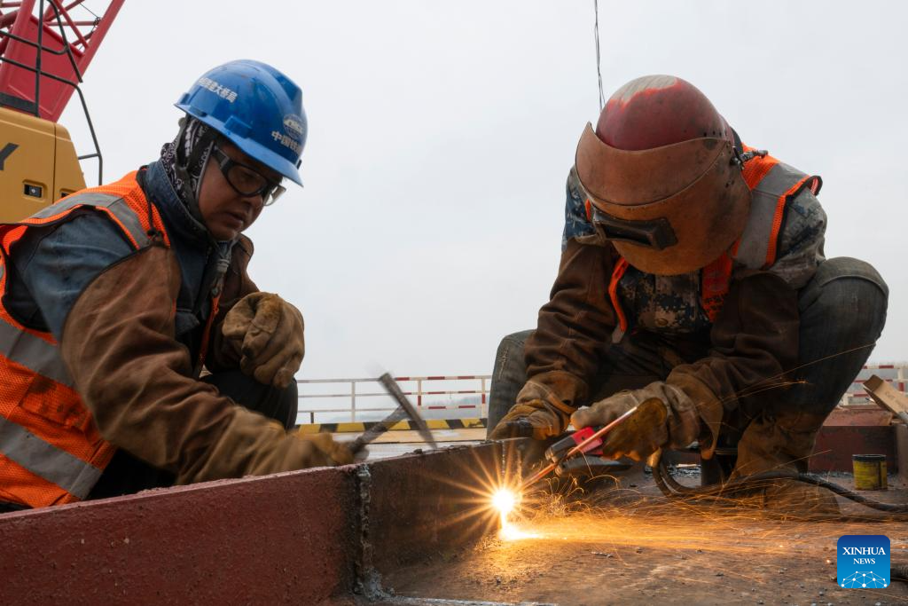 JINGZHOU, 24 diciembre, 2025 (Xinhua) -- Trabajadores son vistos en el sitio de construcción de la torre sur del proyecto del puente carretero y ferroviario sobre el río Yangtze de Libu, en Jingzhou, en la provincia de Hubei, en el centro de China, el 24 de diciembre de 2025. Con un tramo principal de 1.120 metros, el puente carretero y ferroviario sobre el río Yangtze de Libu mejorará aún más la red de tránsito de la Franja Económica del Río Yangtze tras su finalización. (Xinhua/Wu Zhizun)