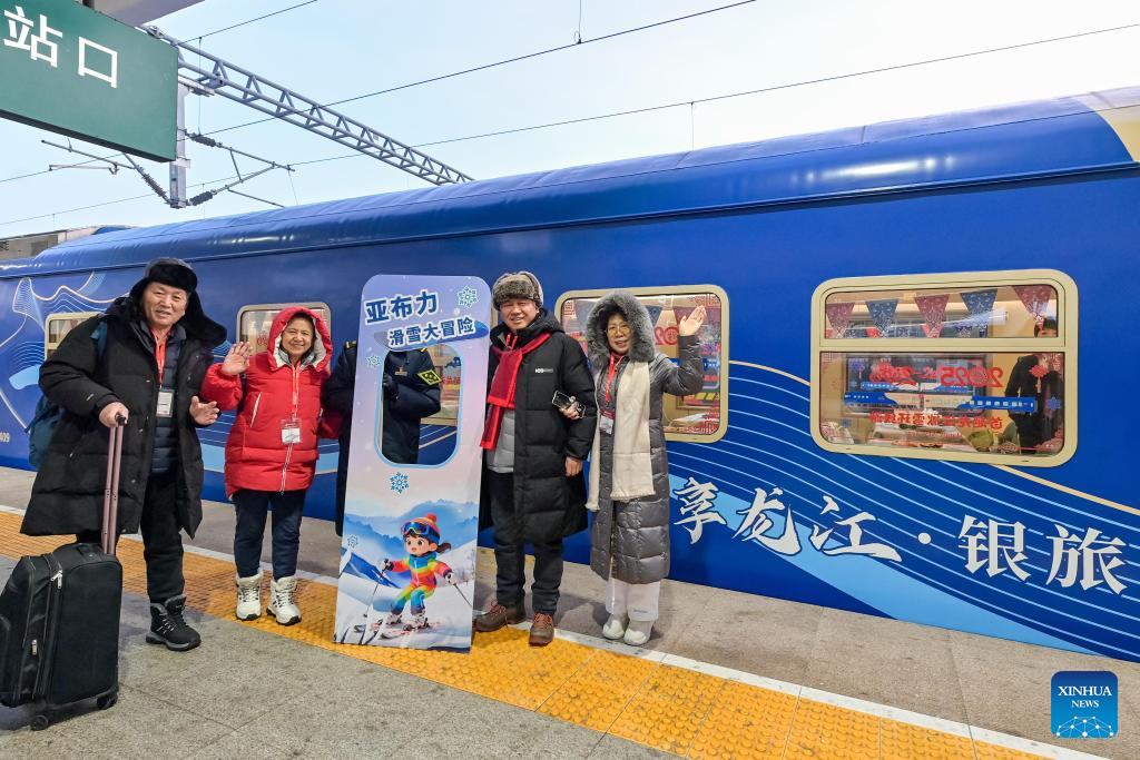 HARBIN, 28 diciembre, 2025 (Xinhua) -- Turistas experimentan la cultura local a bordo de un tren turístico, en la provincia de Heilongjiang, en el noreste de China, el 28 de diciembre de 2025. El tren Y999/998, un tren turístico con temática de hielo y nieve, inició un viaje de seis días el domingo. (Xinhua/Yuan Yong)