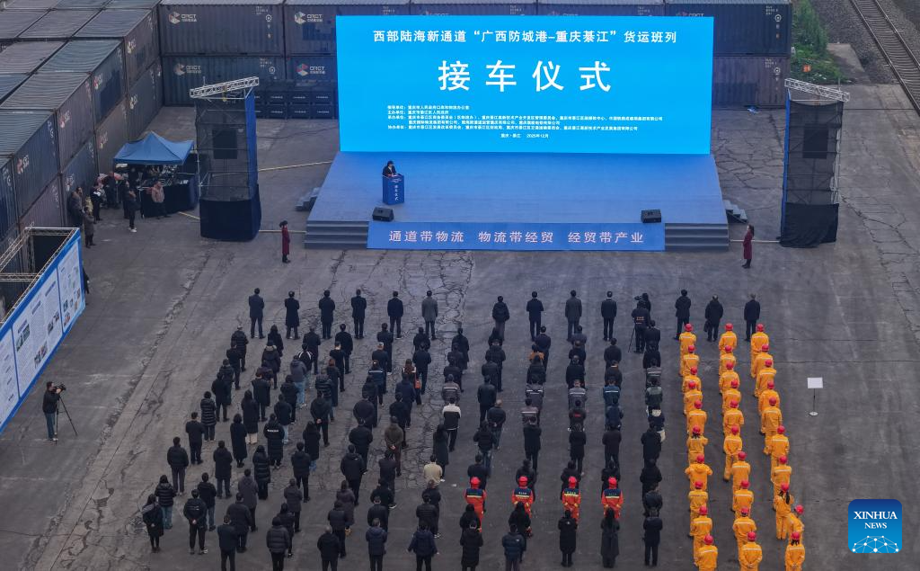 CHONGQING, 29 diciembre, 2025 (Xinhua) -- Vista aérea tomada con un dron el 29 de diciembre de 2025 de una ceremonia de recepción del primer tren de carga desde la ciudad de Fangchenggang de Guangxi hasta el distrito de Qijiang de Chongqing es celebrada en la Estación de Ferrocarril Norte de Qijiang, en la municipalidad de Chongqing, en el suroeste de China. El primer tren de carga del ferrocarril Fangchenggang en Guangxi-Qijiang en Chongqing, parte del servicio ferroviario del Nuevo Corredor de Comercio Internacional Tierra-Mar de China, que es un vínculo logístico crucial entre las regiones interiores occidentales de China y los mercados globales, llegó el lunes a la Estación de Ferrocarril Norte de Qijiang en Chongqing. (Xinhua/Chen Cheng)
