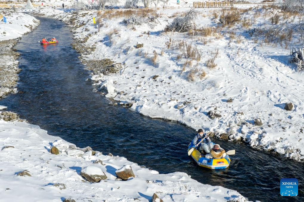 ARXAN, 1 enero, 2026 (Xinhua) -- Vista aérea tomada con un dron de turistas haciendo rafting en el río Halha, en la ciudad de Arxan de la Liga de Hinggan, en la región autónoma de Mongolia Interior, en el norte de China, el 1 de enero de 2026. A pesar del gélido frío invernal de Arxan, esta sección del río Halha, afectada por la geotermia, nunca se congela, lo que atrae a una gran cantidad de turistas en invierno. (Xinhua/Ma Jinrui)
