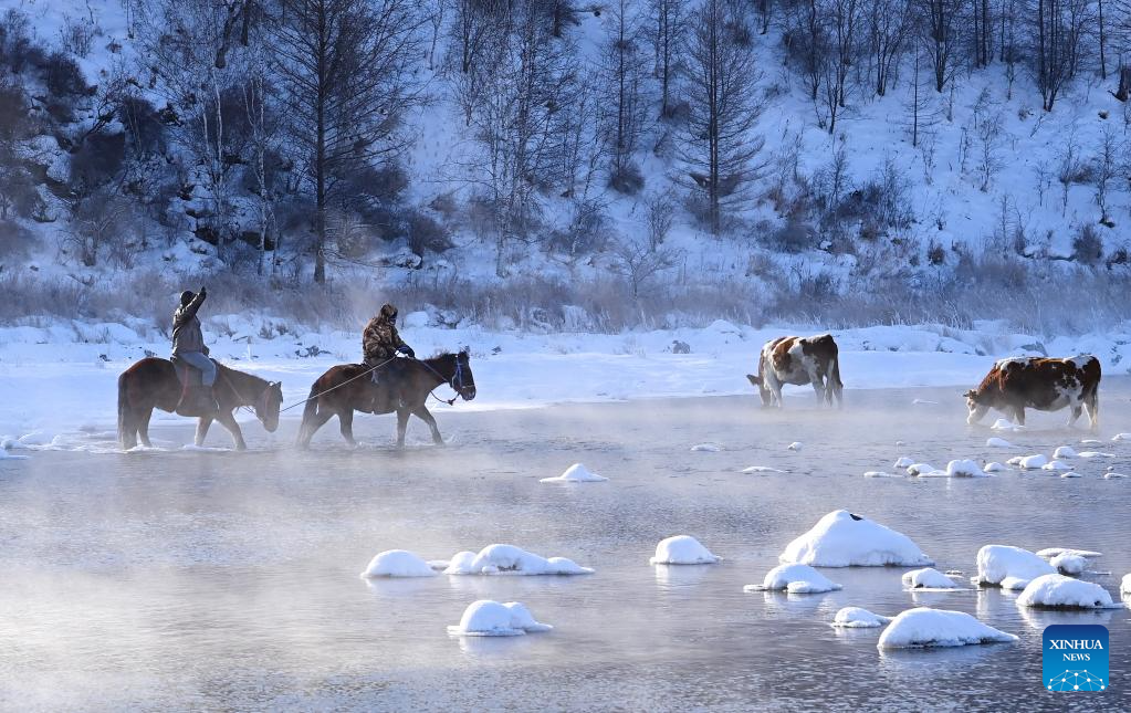 ARXAN, 1 enero, 2026 (Xinhua) -- Turistas montan caballos a través del río Halha, en la ciudad de Arxan de la Liga de Hinggan, en la región autónoma de Mongolia Interior, en el norte de China, el 1 de enero de 2026. A pesar del gélido frío invernal de Arxan, esta sección del río Halha, afectada por la geotermia, nunca se congela, lo que atrae a una gran cantidad de turistas en invierno. (Xinhua/Wang Zheng)