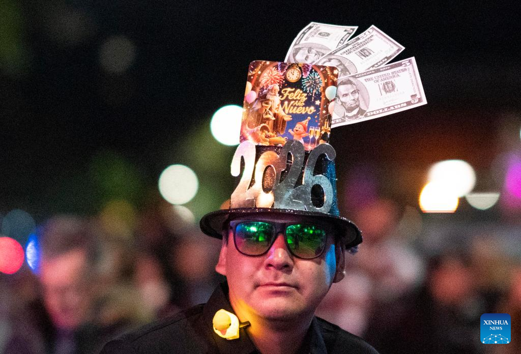 CIUDAD DE MEXICO, 1 enero, 2026 (Xinhua) -- Un hombre porta un sombrero alusivo al año 2026 mientras asiste al Festejo de Año Nuevo en el Angel de la Independencia, en la Ciudad de México, capital de México, el 1 de enero de 2026. (Xinhua/David de la Paz)