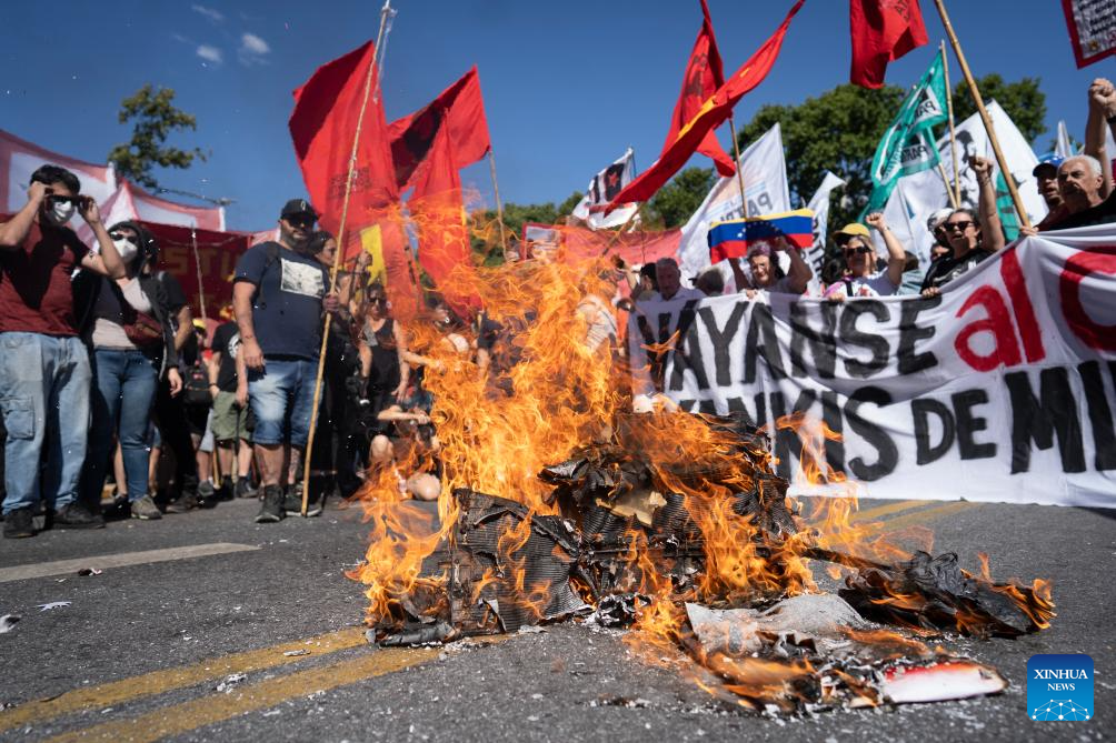 BUENOS AIRES, 3 enero, 2026 (Xinhua) -- Personas queman objetos durante una manifestación frente a la Embajada de Estados Unidos, en la ciudad de Buenos Aires, capital de Argentina, el 3 de enero de 2026. Varios gobiernos latinoamericanos, de diferentes signos políticos, condenaron el sábado la agresión lanzada por Estados Unidos contra Venezuela y la captura del presidente venezolano, Nicolás Maduro, y de su esposa, Cilia Flores. (Xinhua/Martín Zabala)