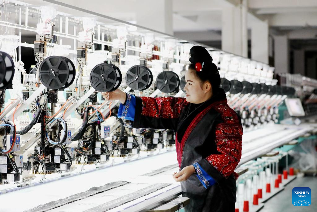 BEIJING, 4 enero, 2026 (Xinhua) -- Una trabajadora opera en un taller inteligente de bordado Miao, en el distrito de Shibing de la prefectura autónoma miao y dong de Qiandongnan, en la provincia de Guizhou, en el suroeste de China, el 4 de enero de 2026. (Xinhua/Tai Shengzhi)