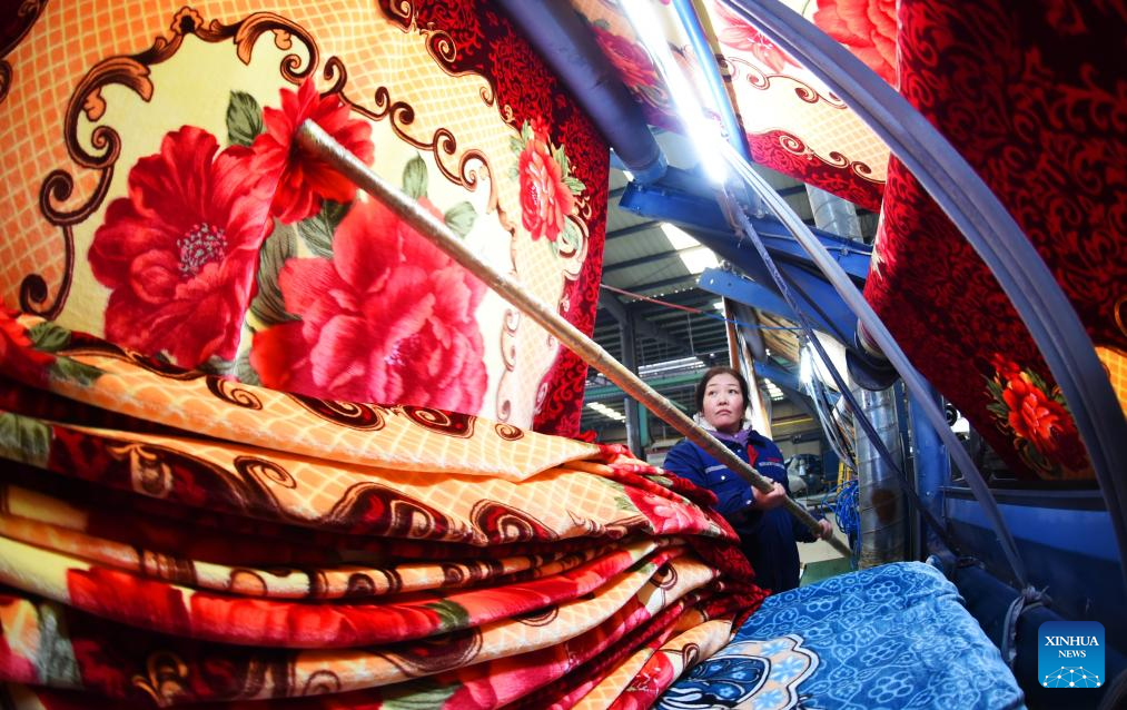 BEIJING, 4 enero, 2026 (Xinhua) -- Una trabajadora opera en una línea de producción de cobijas en el taller de una empresa, en Lianyungang, en la provincia de Jiangsu, en el este de China, el 4 de enero de 2026. (Xinhua/Geng Yuhe)